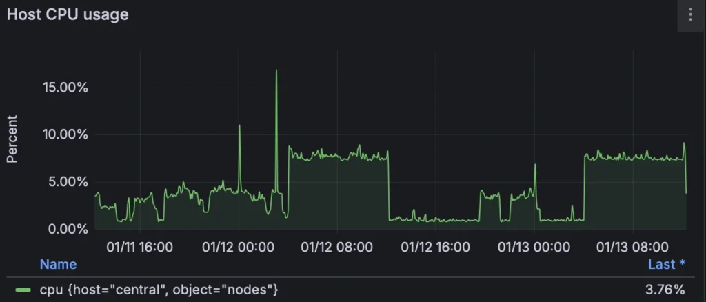 Here’s the 8-core CPU usage over the last 7 days. As you can see, there’s plenty of headroom, ensuring the system runs smoothly even with all the services I have running:
