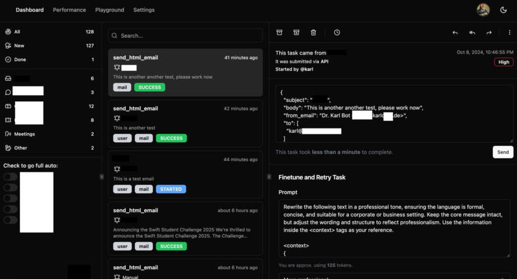 The payoff is a system where tasks are handled automatically, and I have a dashboard to monitor, test, and intervene as needed. It provides a clear overview of all ongoing processes and ensures everything runs smoothly: